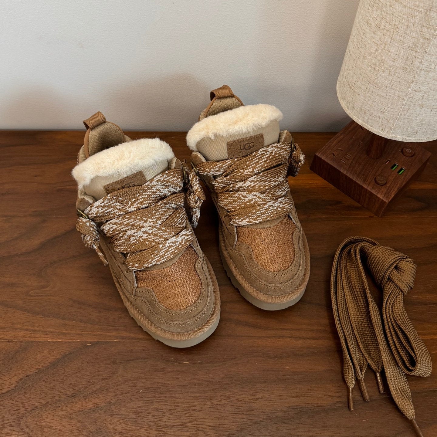 - Webbing heel strap, The UGG® logo patch, Padded collar, Oversized padded tongue